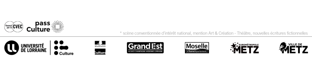 Soutiens en résidence La Méridienne, scène conventionnée art et création de Lunéville (54), le Théâtre de la Tête noire, scène conventionnée des écritures contemporaines de Saran (45), Bords2Scènes, EPCC de Vitry-le-François (51), Espace Bernard-Marie Koltès – Metz (57), le TAPS de Strasbourg (67)